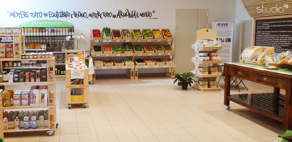 Compito del nostro designer Giovanni Tomasini, creare continuità fra i due ambienti, progettando complementi d’arredo ad-hoc al fine di ottenere uno store accogliente ed al contempo sfruttare al meglio gli spazi in funzione del percorso di vendita. L’eco design qui è di scena: l’allestimento in legno naturale ben si accosta ai prodotti biologici in esposizione; a realizzarlo la cooperativa PALM W&P che da anni opera seguendo rigidi criteri di eco-progettazione, dando forte valore alla materia prima del legno locale e favorendo anche l’inserimento lavorativo di ragazzi svantaggiati.