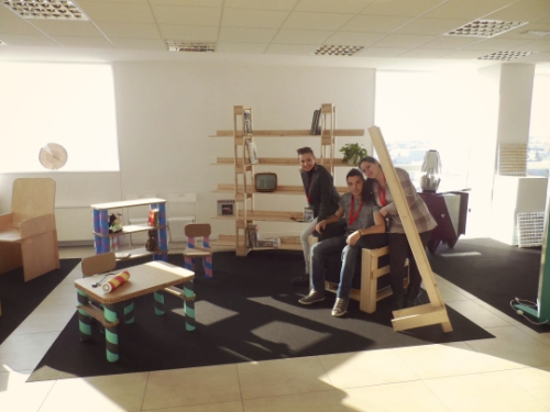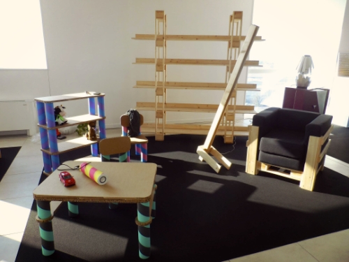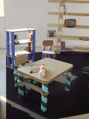 La prima, “Friend of paper”, è una linea di mobili per bambini, tavolino con sedie più libreria, composti da cartone, di cui il 50% di recupero, grazie al riutilizzo dei tubolari colorati, in precedenza impiegati per la roccatura dei filati; il restante materiale delle parti di giunzione e dei ripiani sono composti in cartone alveolare assemblati con colle atossiche a base d’acqua.