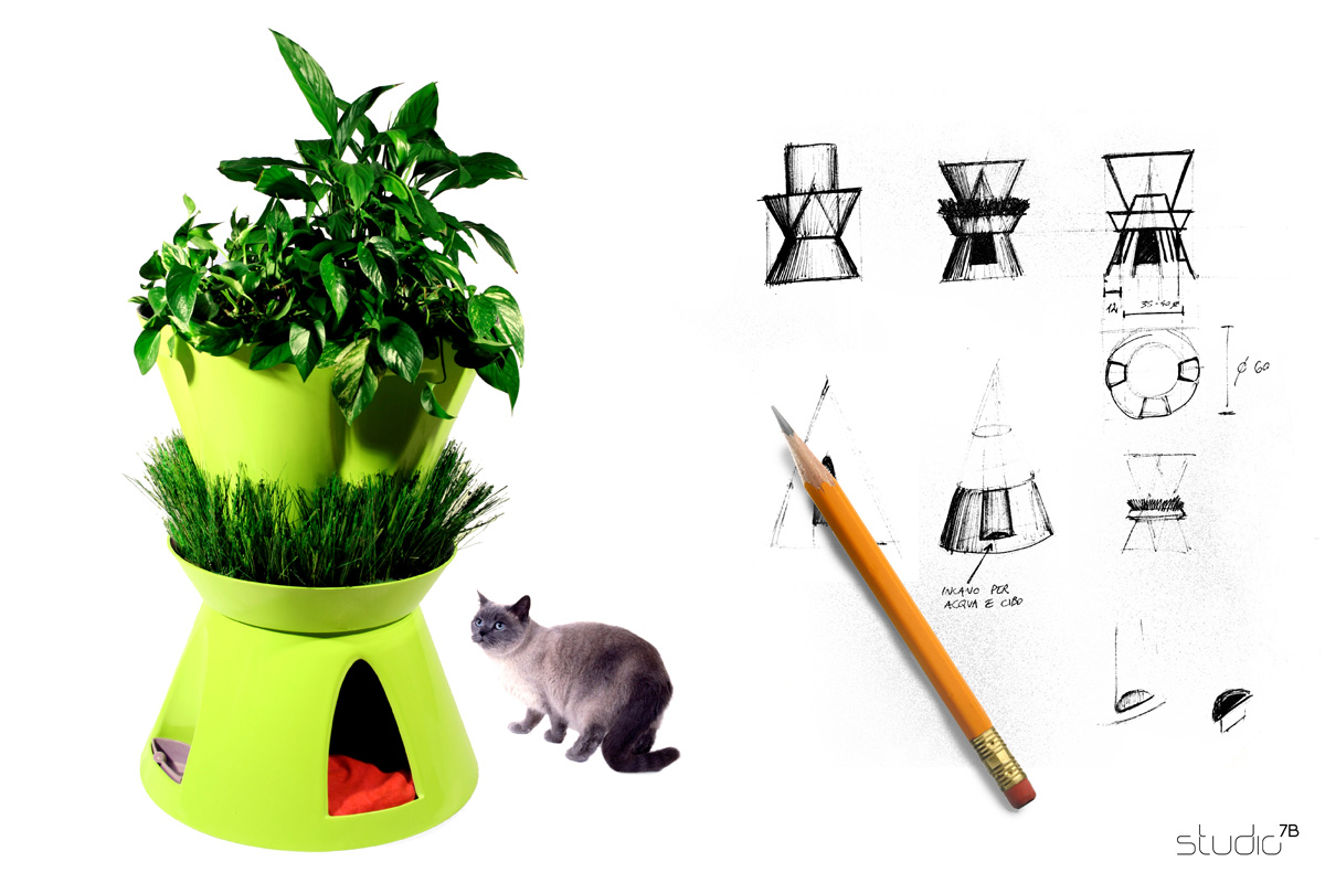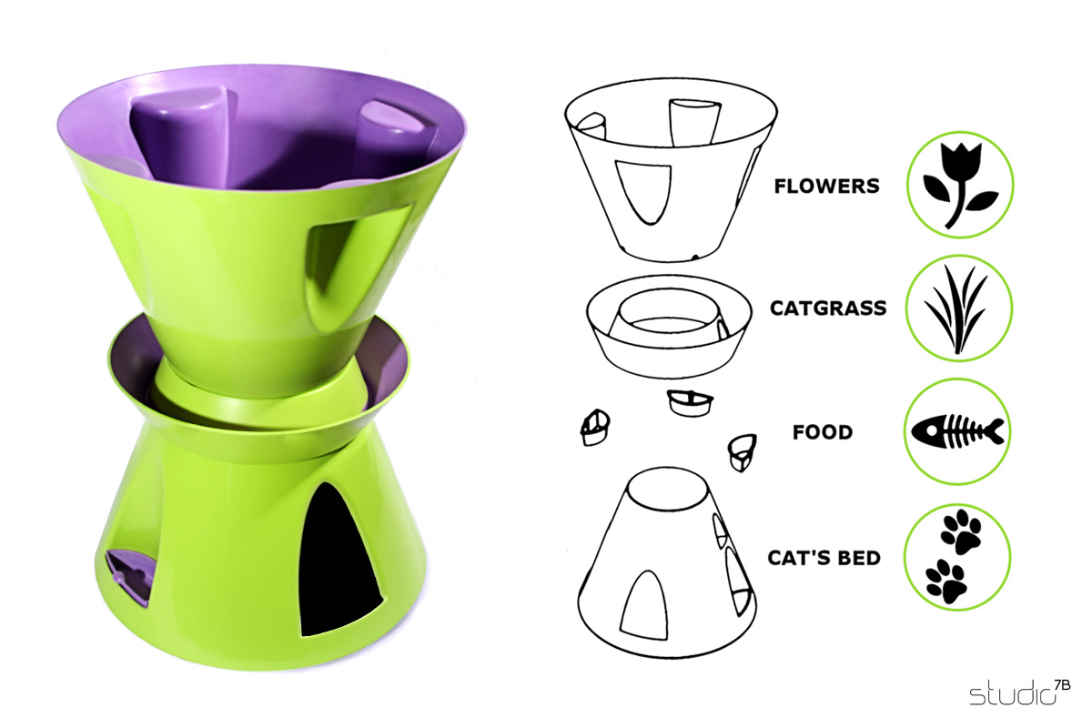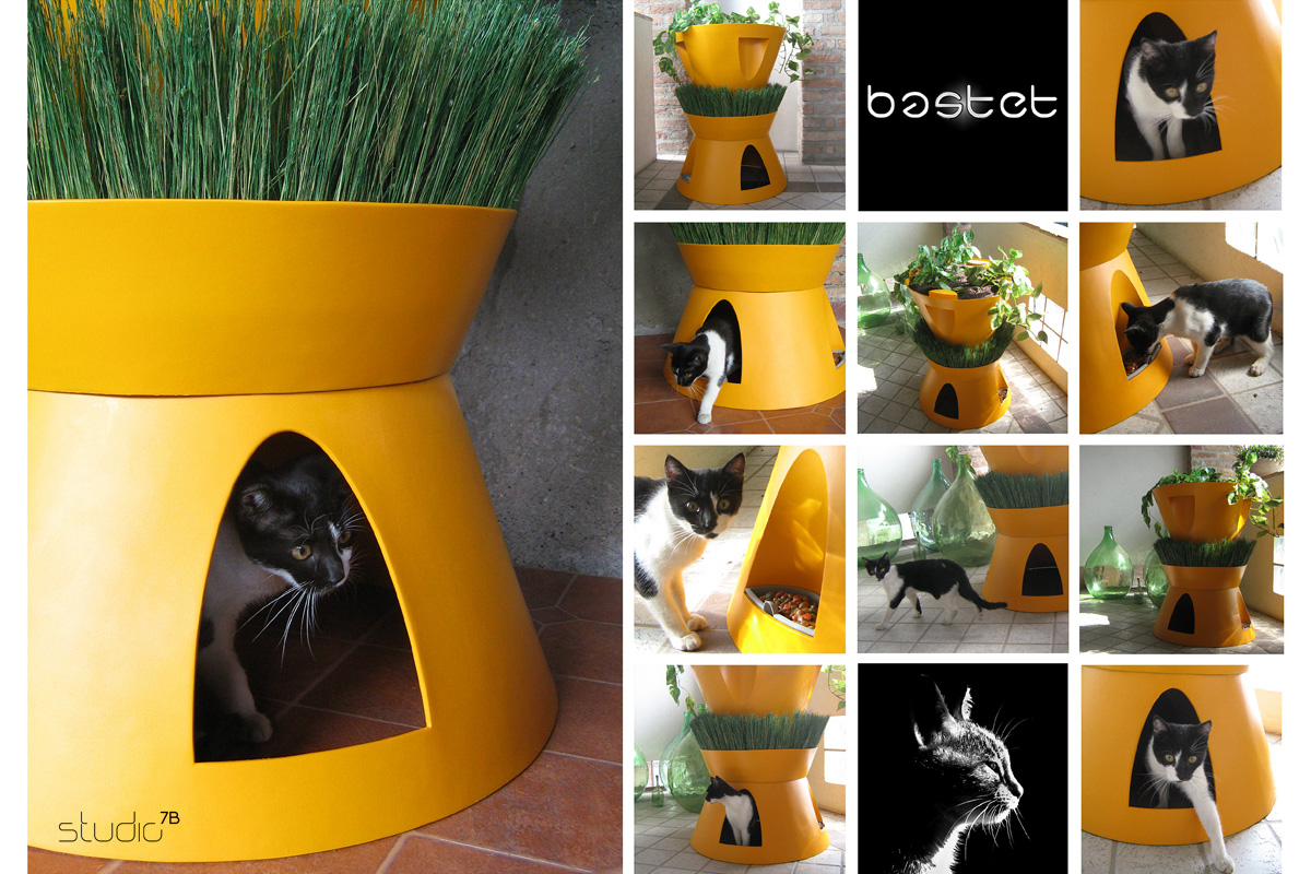 Un gatto ha bisogno di una tana confortevole e di ciotole per acqua e cibo. Il suo padrone ha spesso esigenze di spazio e deve salvaguardare il verde domestico dagli attacchi del felino. Bastet è una casa speciale per gatti: a pian terreno la cuccia e le ciotole, al primo piano una corona circolare per seminare erba gatta e sopra di questa un “attico” adibito giardino.