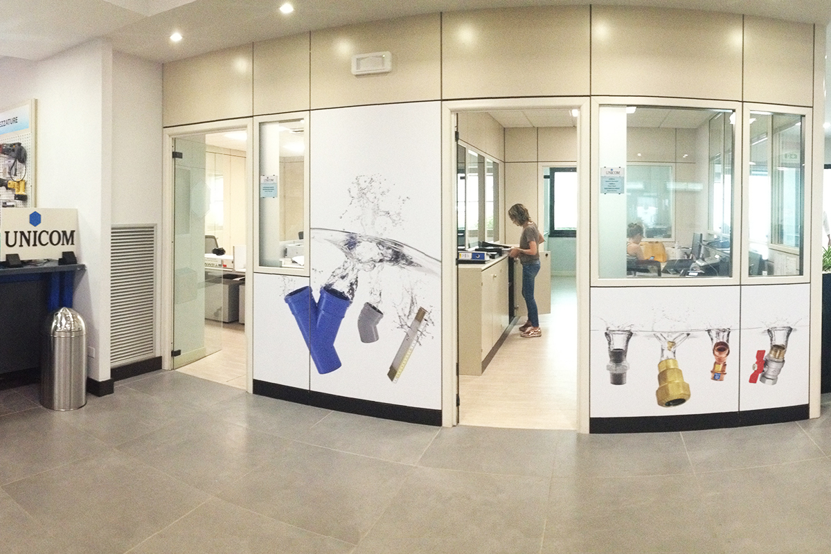 Studio7B, studio esperto in comunicazione e grafica, ha tradotto questo messaggio in una serie di grafiche wallwrap, applicate alle pareti ed ai pannelli in modo tale da circondare l’ampia sala, trasportando chi vi entra nel mondo dell’acqua e mettendo al contempo, egregiamente in mostra, i principali prodotti che Unicom può offrire ai suoi clienti.